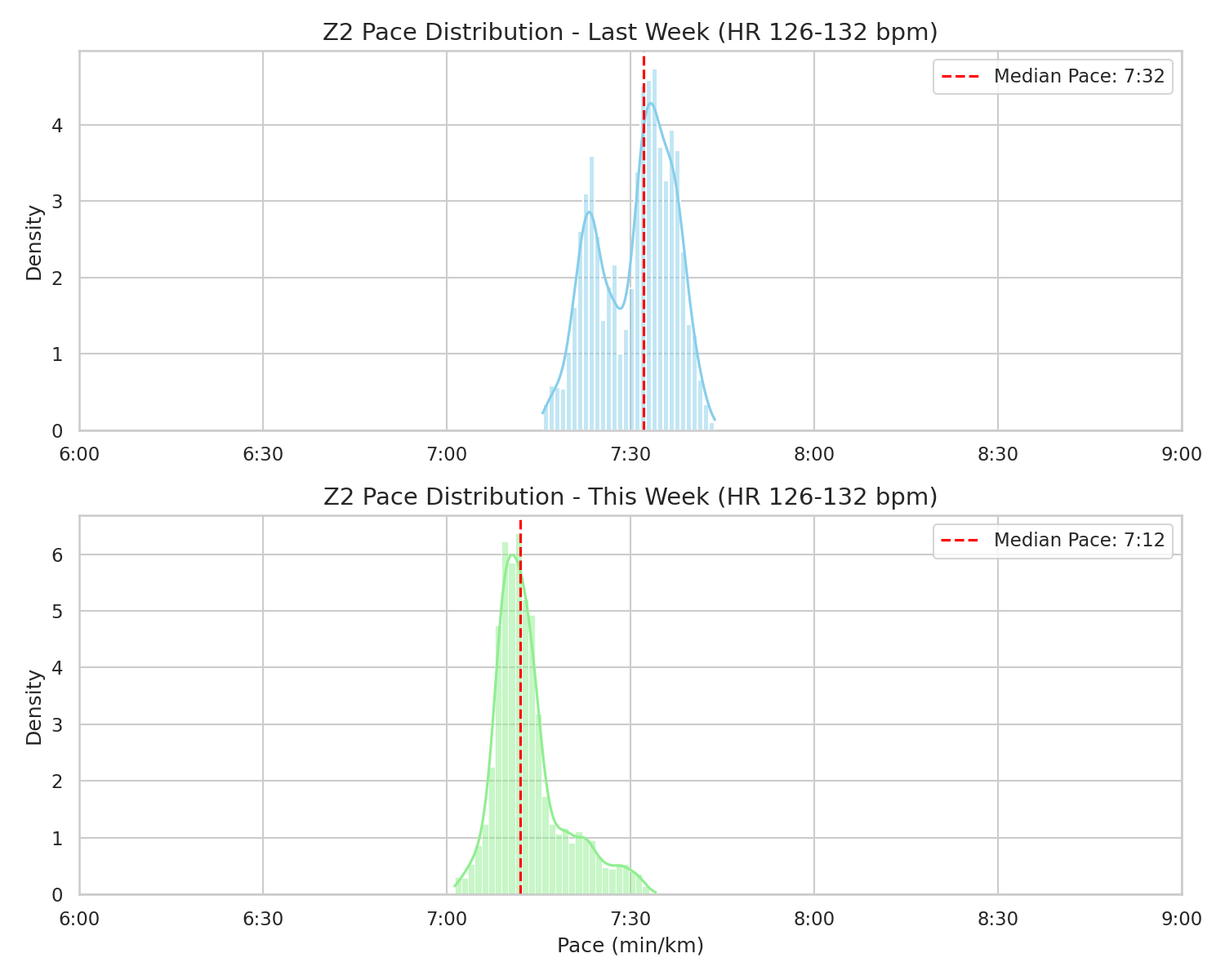 データにもちゃんと表れていました。次の図は1週間のランニングのログデータからゾーン2の上限である心拍数126bpm~132bpmの範囲でのペースの分布をプロットしたものです。上の図が前の週、下の図が今週です。